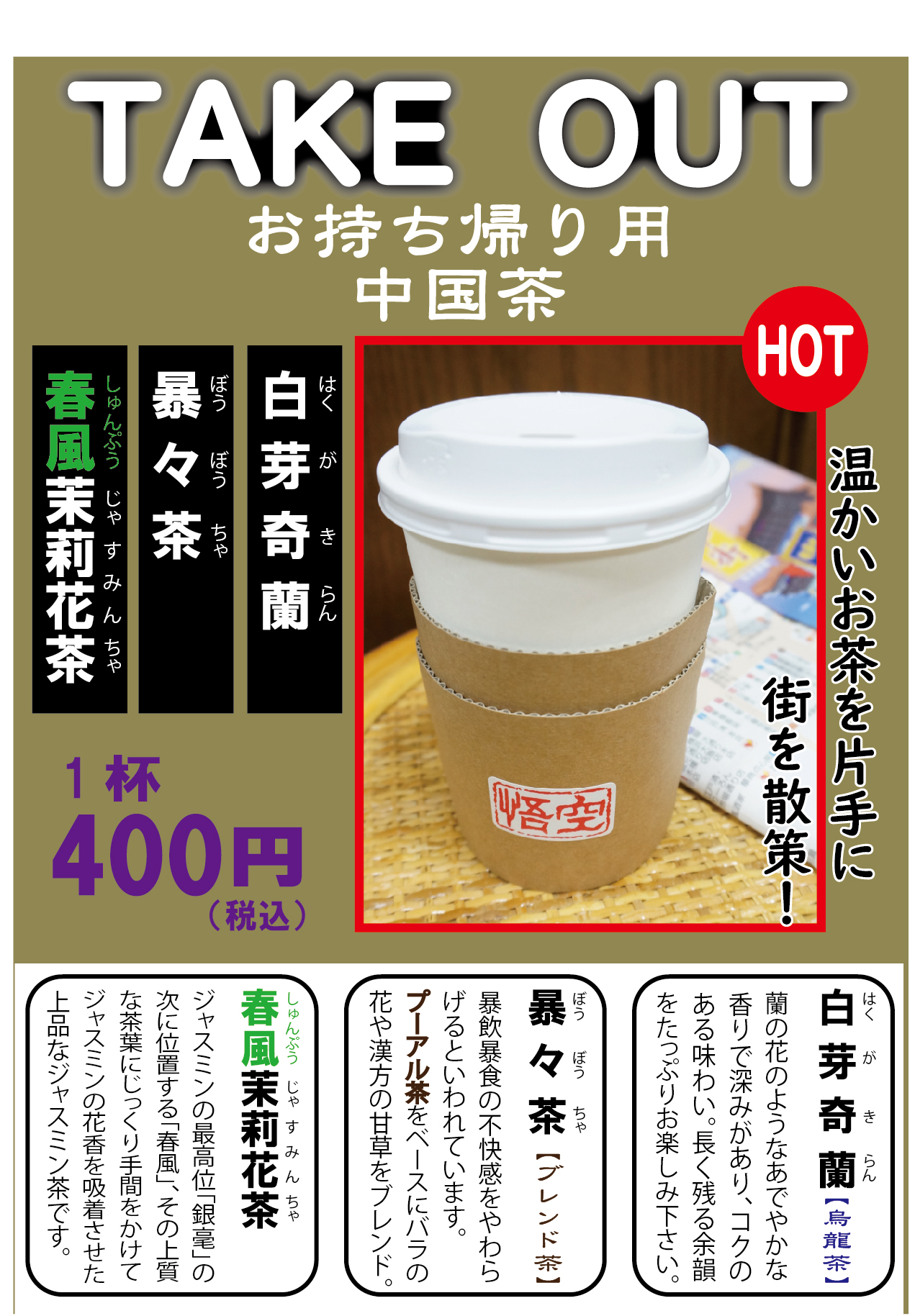 悟空一号店にて、10月10日~HOTテイクアウトティー「春風茉莉花茶」「白芽奇蘭」「暴々茶」を販売いたします。