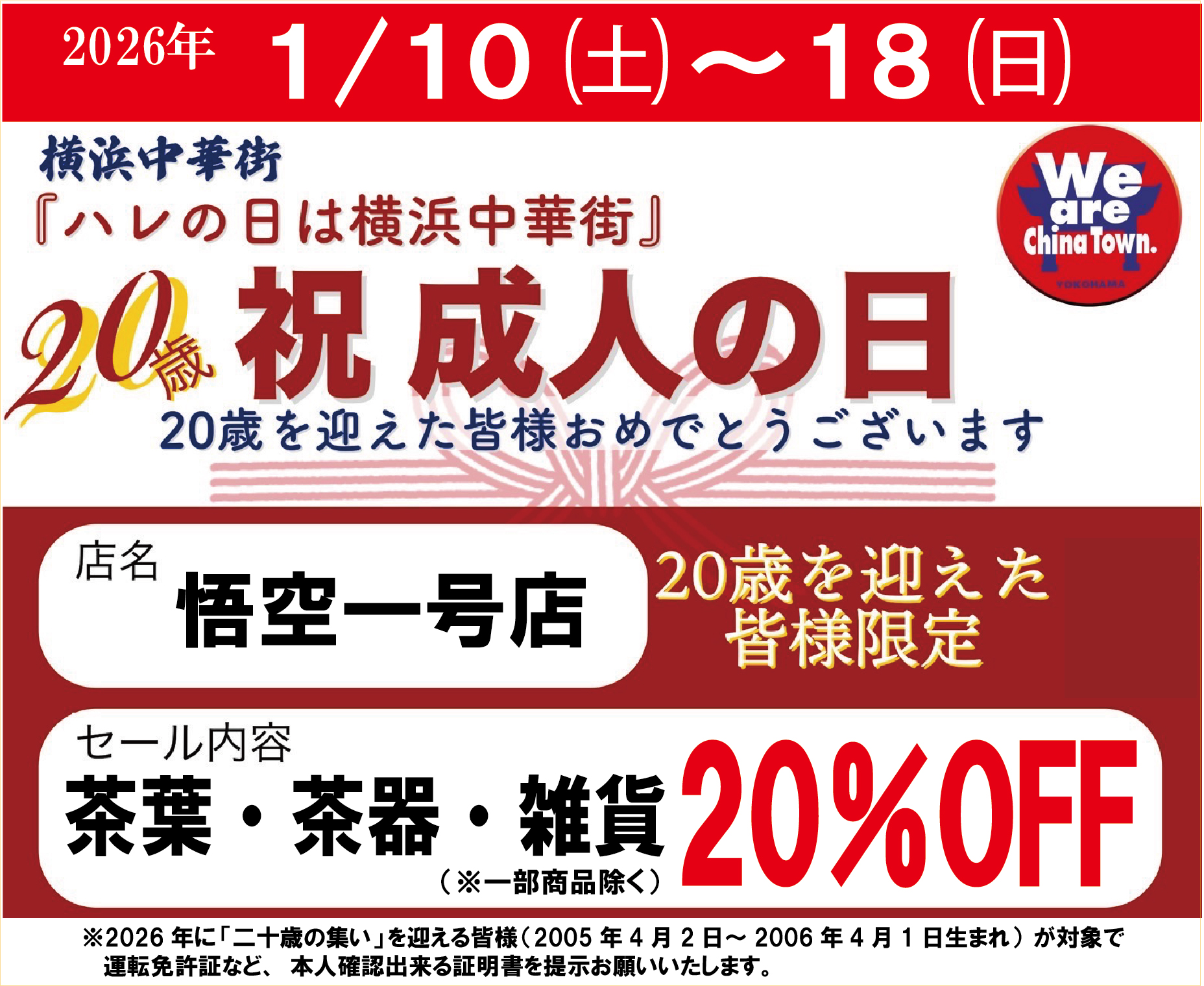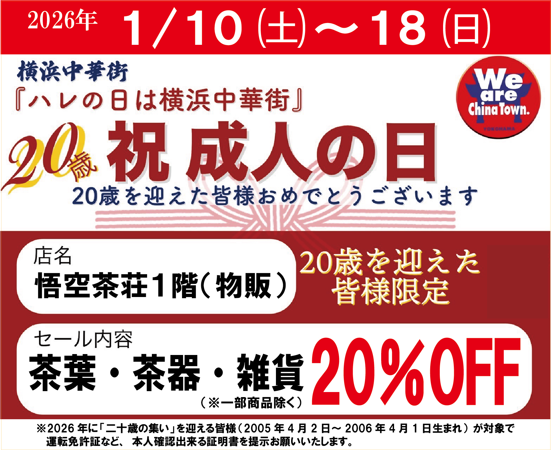2026年1月10日~18日 『ハレの日は中華街』祝成人の日20%OFFセール開催いたします!
